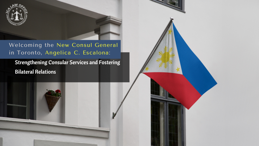 JCA Law Office Professional Corporation takes great pleasure in announcing and extending a warm welcome to the Hon. Angelica C. Escalona, the newly appointed Consul General of the Philippines in Toronto. She assumed her position on May 17, 2023. With a strong background in consular affairs and a Master of Arts degree in Foreign Affairs and Trade, Consul General Escalona brings a wealth of experience and expertise to her role. Her focus on enhancing consular services, engaging with the Filipino community, and promoting bilateral relations reflects her commitment to serving her fellow Filipinos and fostering strong ties between the Philippines and Canada.
